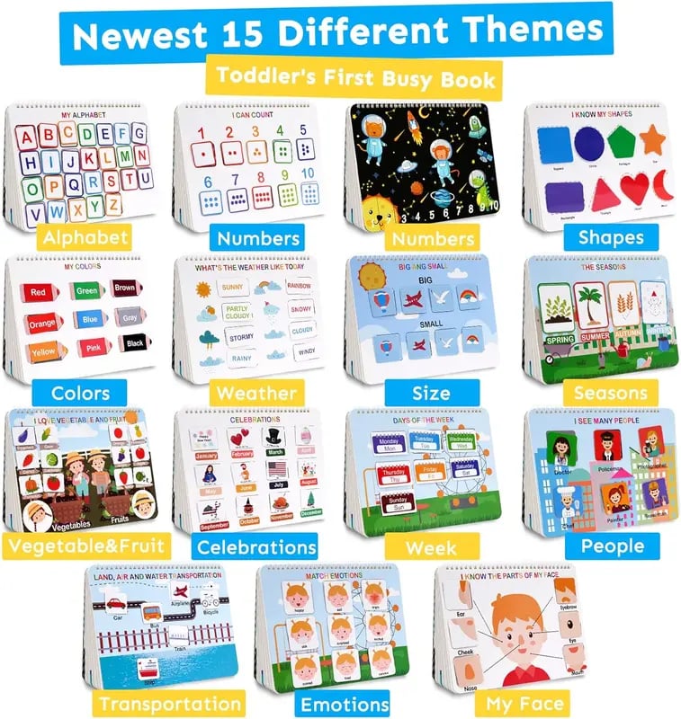 ć15 THEMES AND 14 DRAWING&WRITING PAGESć This Busy Book covers 15 themes, including numbers, alphabet, Food & drink, fruits, animals, rainbow, colors, shapes, size discrimination, transportation, weather, week, seasons, holidays and planets. Each themes can enrich the child's knowledge base. There is also a 14-page drawing and writing page to meet the needs of children who love to write and paint, and is equipped with 8 colored pens