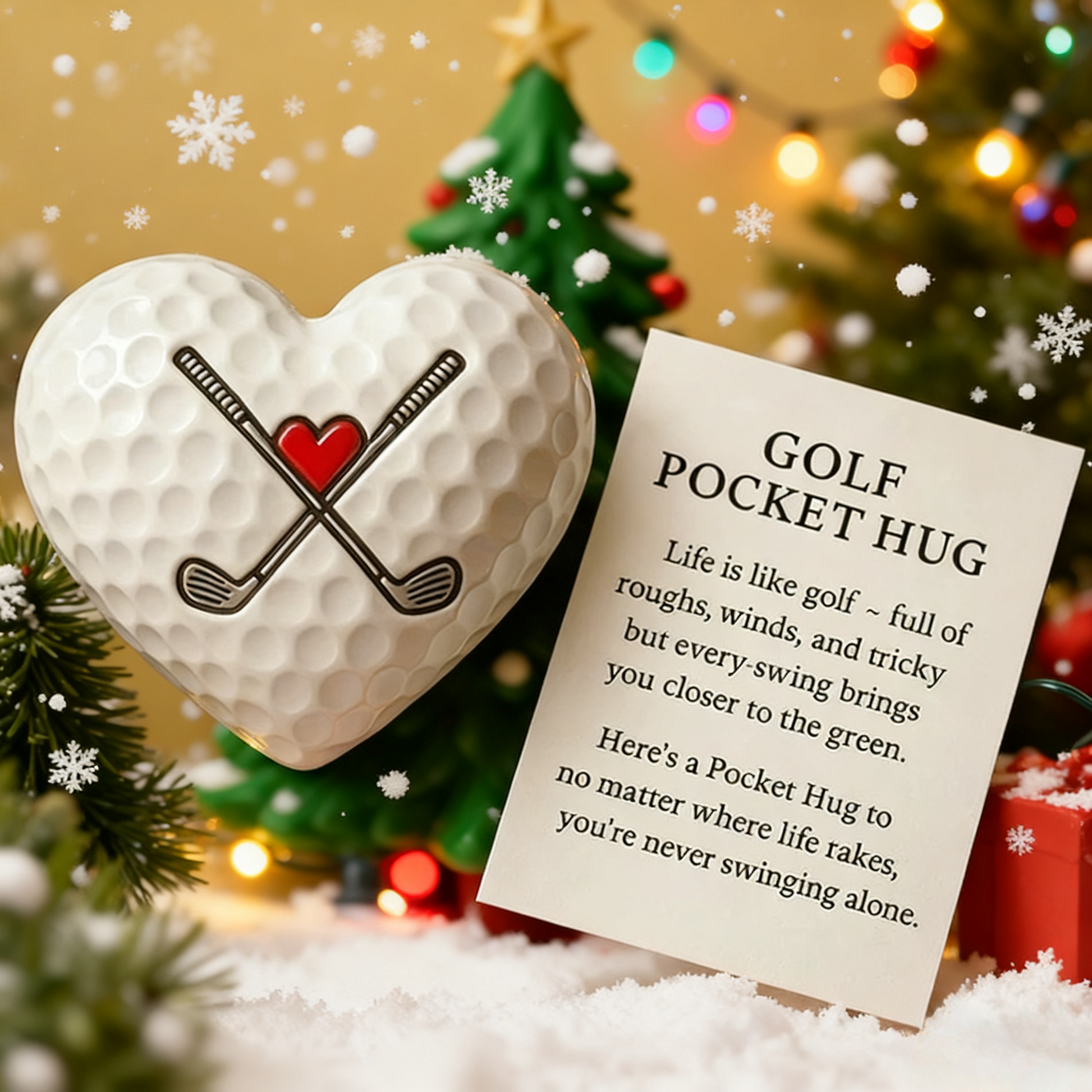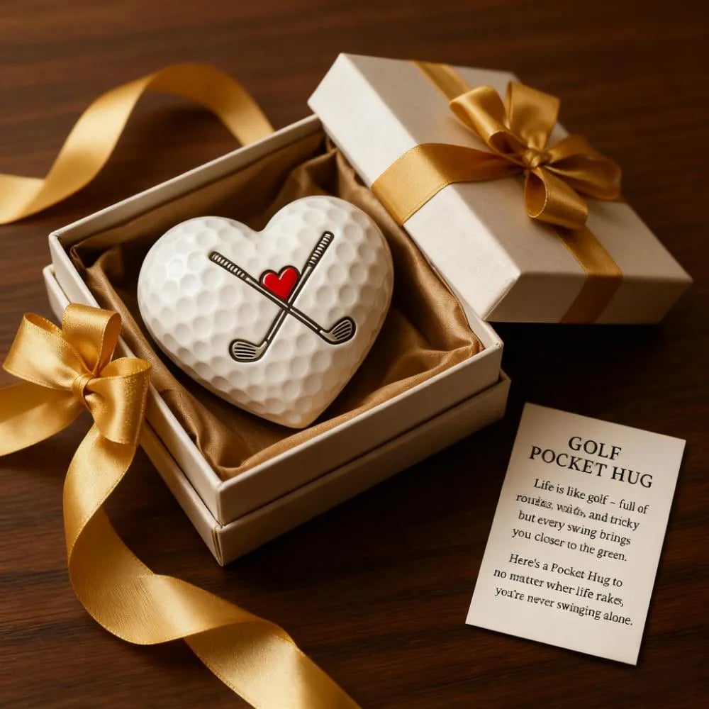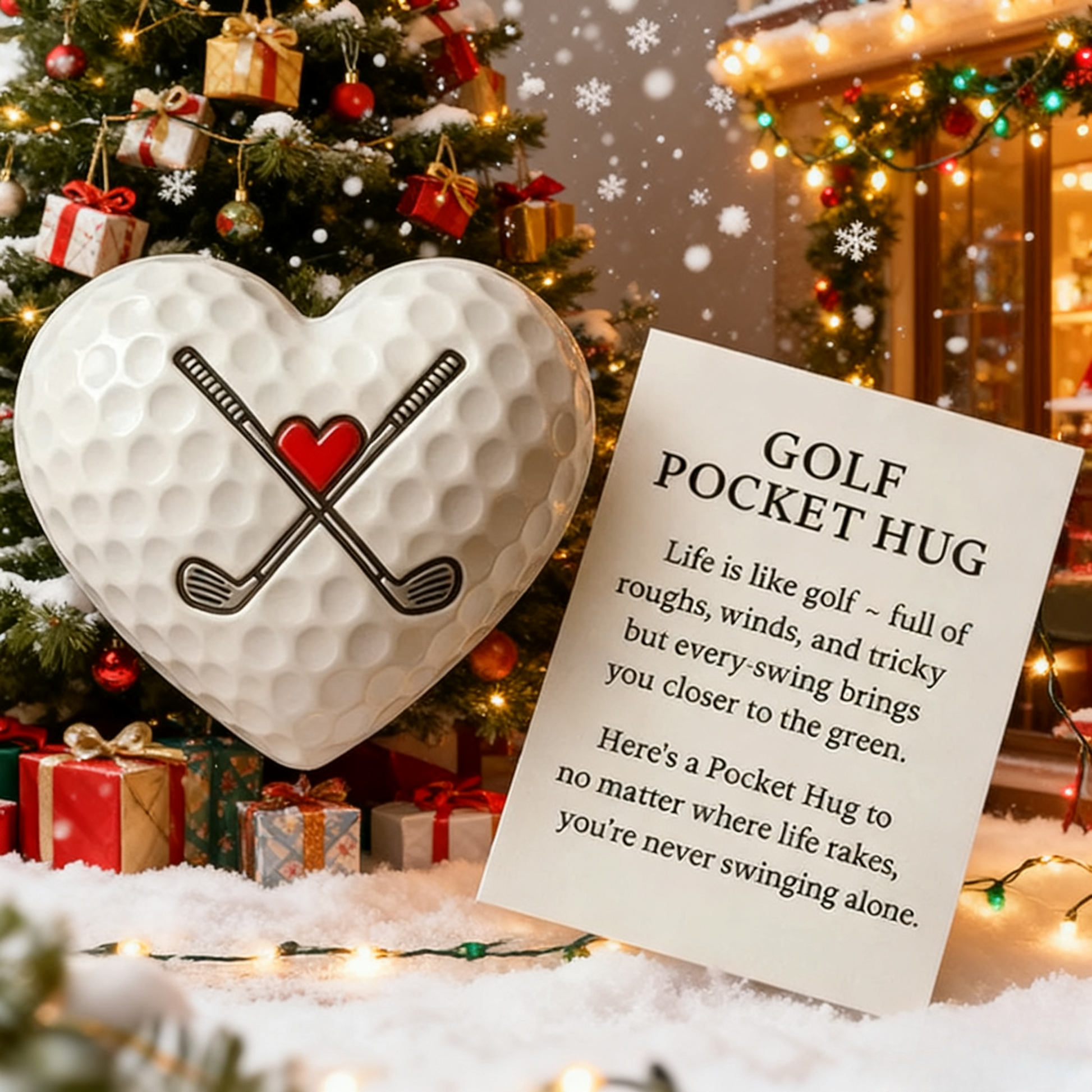 ❤️Shaped like a heart with golf ball texture, featuring crossed golf clubs and a red heart, it’s a sweet reminder that you’re never alone in life’s “rounds”. Paired with the heartfelt note: “Life is like golf ~ full of roughs, winds, and tricky moments, but every swing brings you closer to the green. Here's a Pocket Hug to remind you: no matter where life takes you, you're never swinging alone.”
